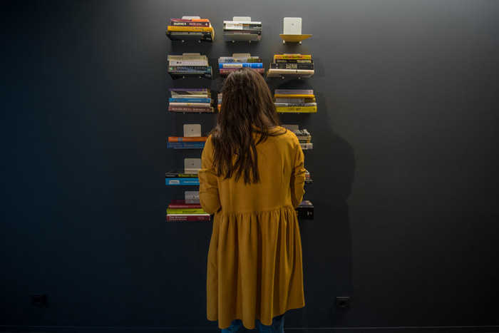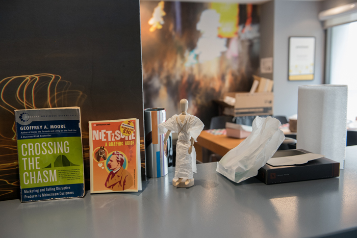 Η διαρρύθμιση σε όλους τους ορόφους δίνει την αίσθηση από πολλές μικρές κυψέλες με γυάλινα διαχωριστικά, χώροι όπου γίνονται τα meetings ή απλώς μπορεί κανείς να καθίσει για να ξεφυλλίσει κάποιο από τα βιβλία που βρίσκονται διάσπαρτα σε όλα τα δωμάτια και στα ράφια των βιβλιοθηκών. Βλέπουμε τίτλους με urban χιούμορ και θεματική: τεύχη του Monocle, τα αποφθέγματα του Νίτσε, δίπλα σε μικρά γκάτζετς και διακοσμητικά αντικείμενα, σπαστές κούκλες-μοντέλα ζωγραφικής, φωτογραφίες πολαρόιντ από τα παιδιά της ομάδας, χρωματιστά μαξιλάρια με το λογότυπο του Τaxibeat, αστεία knickknacks κρεμασμένα στους τοίχους. Μία επιφάνεια γεμάτη με τα πρώτα tweets που είχαν ποσταριστεί από πελάτες με το tag του Τaxibeat. Σε έναν άλλο τοίχο, όλη η υδρόγειος σε ανάπτυγμα «πεταλούδα» όπου είναι σημειωμένα με κόκκινα καρφάκια οι πόλεις όπου το Taxibeat έχει παρουσία. Άλλωστε όλες οι επιφάνειες σε αυτά τα γραφεία είναι σαν boards, μπορείς να γράψεις επάνω τους με κιμωλίες και με μαρκαδόρους. Βλέπουμε καλημέρες, ευχές, υπολογισμούς, αριθμητικές πράξεις, memo, δικά τους αστεία. Όλοι οι χώροι εκπέμπουν μηνύματα μέσα από τη μίνιμαλ αισθητική τους: μία κατακόκκινη, λαμπερή ηλεκτρική κιθάρα σε ένα stand στη γωνία, το μικρό γυαλιστερό, λαχανί ρομποτάκι του Android απέναντι. Πουθενά στα γραφεία δεν υπάρχουν post-it και στοίβες χαρτιά προς ανακύκλωση. Πουθενά «γραφική ύλη». Παρά απαλές γραμμές a la Starck, χρώματα από μοντέρνα παλέτα, σημεία και λεπτομέρειες ιδανικά για φωτογραφίες Ιnstagram.