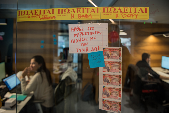 Στην πολύχρωμη κουζίνα με τις κατακόκκινες λεπτομέρειες, την ώρα που περνάμε, υπάρχει η κινητικότητα του πρωινού καφέ. Ξεκίνημα γύρω στις 10.30. Αλλά και το διάλειμμα για φαγητό γίνεται ομαδικά. «Προσπαθούμε να τρώμε μαζί, σαν παρέα, να μην τρώμε στα γραφεία μας. Είναι η κουλτούρα του να είμαστε όλοι μαζί» λέει η ξεναγός μας, Θάλεια Γελαδάκη, επικεφαλής στο τμήμα μάρκετινγκ.