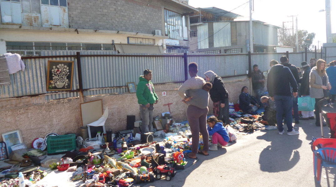 Διασχίζοντας την οδό Πολυκάρπου, για να βρούμε το επόμενο παζάρι, περνάμε μπροστά από τη δομή φιλοξενίας στον Ελαιώνα, εκεί όπου ζουν 2.300 πρόσφυγες, κυρίως από τη Συρία και το Αφγανιστάν, αν και οι εθνικότητες που μπορεί να συναντήσει κάποιος φτάνουν τις είκοσι μία. Προσφυγάκια με ποδήλατα, μπροστά από τη δομή, δεν ξεμυτίζουν, σε αντίθεση με τα μικρά τσιγγανόπουλα που αλωνίζουν με τα δικά τους ποδήλατα την περιοχή. Τελικά ό,τι και να συμβαίνει στον κόσμο ένα παιδί με ποδήλατο θα βρει χώρο για βόλτα. Λακκούβες με νερά σε μέγεθος μικρής λίμνης, αλλά το ποδήλατο ασταμάτητο. Ακόμα κι εκεί, μπροστά από άδεια κτίρια με σπασμένα τζάμια και βουνά από σκουπίδια.