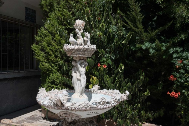 Δεν είναι όμως αυτό το μοναδικό περίεργο αξιοθέατο της οδού. Στην είσοδο μιας πολυκατοικίας στον αριθμό 40, μπροστά από μια ανθισμένη βιγκόνια βρίσκεται ένα επιβλητικό συντριβάνι. Διακοσμημένο αποκλειστικά με κοχύλια, διαθέτει τρία επίπεδα. Το δεύτερο συγκρατούν τέσσερις (μάλλον) Αφροδίτες, ενώ στην κορυφή του δεσπόζουν ένα περιστέρι, ένας σκίουρος που κραδαίνει με ευχαρίστηση ένα φουντούκι και στη μέση, ένα μωρό που μοιάζει με το Manneken Pis των Βρυξελλών και κρατά πάνω από τους ώμους του με το ένα χέρι ένα τεράστιο κοχύλι. Πάνω στο συντριβάνι υπάρχει η επιγραφή «Βραχνός Γ. Τάκης 1980», που μας πληροφορεί πιθανόν για τον δημιουργό και την ημερομηνία κατασκευής.