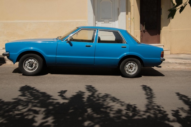 Ο ήλιος παιχνιδίζει πάνω σε μία καλογυαλισμένη μπλε Ford Cortina με λεοπάρ καθίσματα