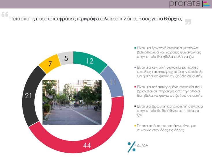 Η Ερώτηση της Εβδομάδας από την Prorata έθεσε το ερώτημα στους συμμετέχοντες στις online έρευνες της εταιρείας και κατέγραψε την υπεροχή της άποψης ότι τα Εξάρχεια είναι μια ταλαιπωρημένη συνοικία που βρίσκεται σε παρακμή και από την οποία ο μέσος πολίτης θα ήθελε να φύγει, αν ζούσε σε αυτήν (44%). Η κυρίαρχη αυτή άποψη μοιάζει να είναι μια σχετικά ουδέτερη αποτίμηση της πραγματικότητας σε σχέση με την περισσότερο κάθετη άποψη ότι τα Εξάρχεια είναι μια βρώμικη και σκοτεινή συνοικία όπου ο μέσος πολίτης δε θα ήθελε με τίποτα να μείνει, η οποία καταγράφηκε ως η δεύτερη ισχυρότερη στις επιλογές του δείγματος (21%). Την άποψη αυτή επέλεξαν συχνότερα οι εκτός Αττικής ερωτηθέντες, οι οποίοι και είναι λιγότερο πιθανό να έχουν την πραγματική εικόνα της καθημερινότητας στη συνοικία, κάτι που συνιστά ένδειξη της ύπαρξης ενός αρνητικού στερεοτύπου για την περιοχή, το οποίο και αναπαράγεται από πομπούς μηνυμάτων πανεθνικής εμβέλειας, όπως τα μέσα μαζικής ενημέρωσης.
