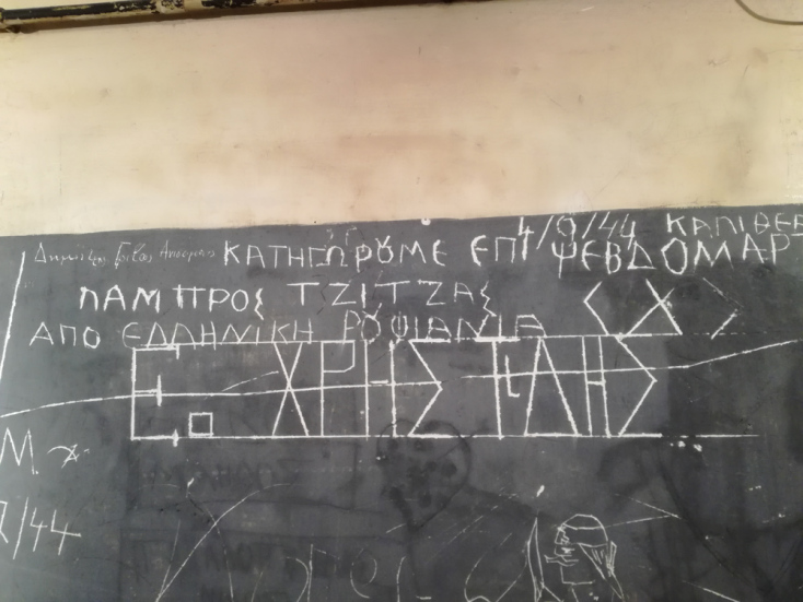 Στον τοίχο του πρώτου θαλάμου του 2ου υπογείου υπάρχει ένα σκίτσο του Μουσολίνι, που έφτιαξε ιταλός κρατούμενος. Αν κάποιος παρατηρήσει το σκίτσο θα δει ότι έχει πάνω του μερικές τρύπες. Λέγεται ότι αυτές προήλθαν μετά την επίταξη του κτιρίου από το ΕΑΜ, όταν ένας ένοπλος κατέβηκε στο υπόγειο και μόλις αντίκρισε το σκίτσο και συναισθηματικά φορτισμένος όπως ήταν από όλα όσα είδε στον χώρο, έβγαλε το πιστόλι του και πυροβόλησε πάνω στο σκίτσο.