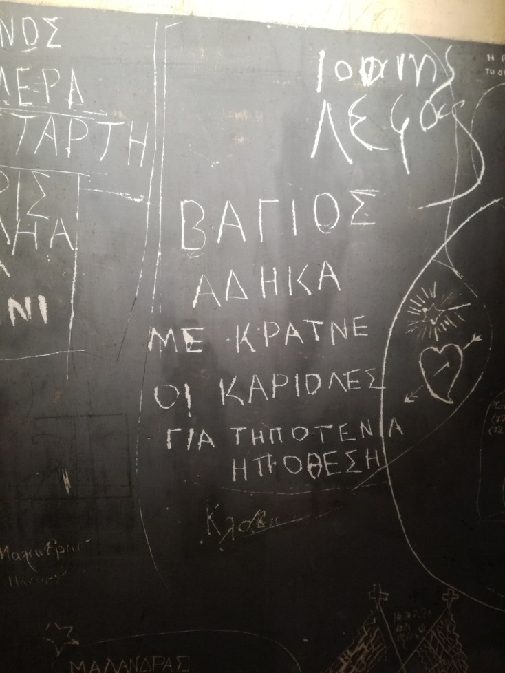 Σώζονται μερικά προσωπικά αντικείμενα των κρατουμένων και πάνω στους τοίχους μπορεί κανείς να δει διάφορα ακιδογραφήματα, να διαβάσει επιγραφές, ονόματα, μηνύματα σε διάφορες γλώσσες (ελληνικά, αγγλικά, ιταλικά, γερμανικά). Τα μηνύματα αυτά, οι ζωγραφιές, οι κατάρες, οι ευχές, οι παρακλήσεις, οι ερωτικές καρδούλες, τα ονόματα καταδοτών... σε κάνουν να αισθανθείς ένα φοβερό ψυχοπλάκωμα αλλά και πολύ έντονη την παρουσία όλων των ανθρώπων που πέρασαν από κει μέσα και άφησαν το αποτύπωμά τους στην ιστορία πάνω στους ασβεστωμένους τοίχους αυτών των υπογείων και σου δίνουν την ευκαιρία να τους γνωρίσεις, έστω και μ’ αυτό τον παράδοξο τρόπο.
