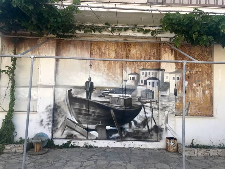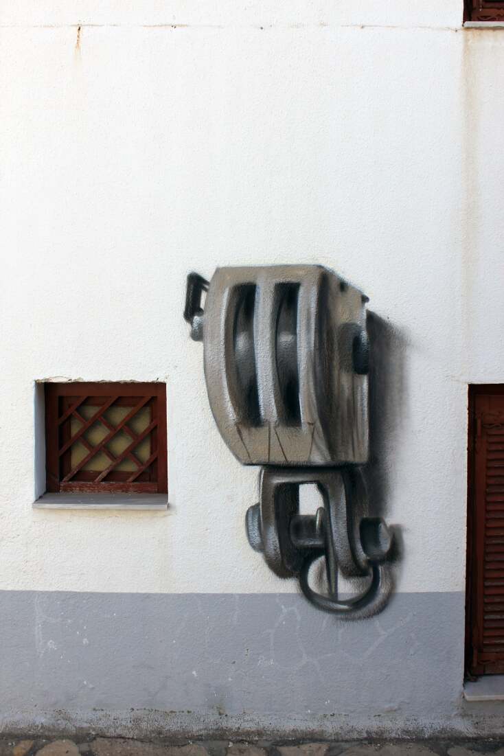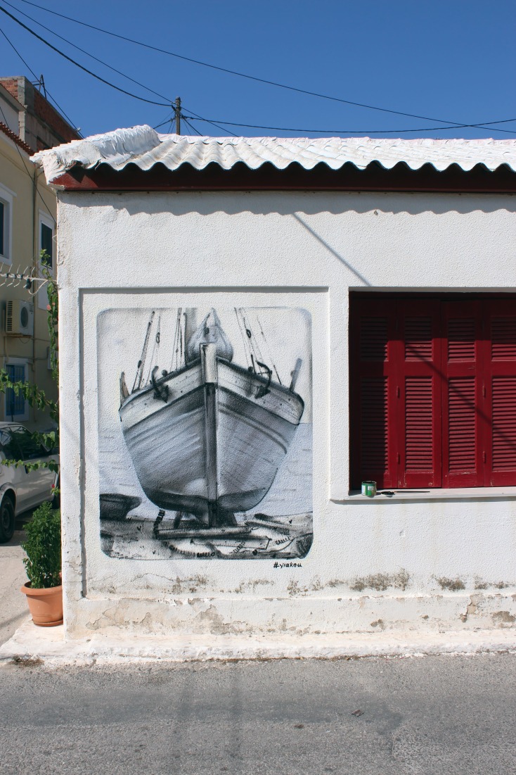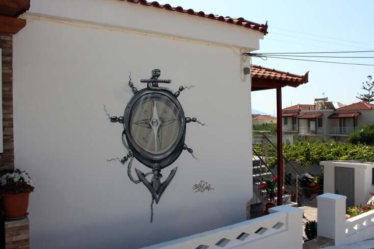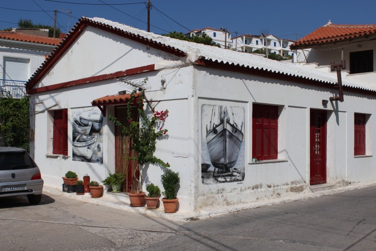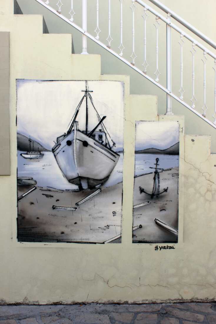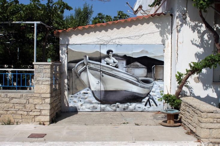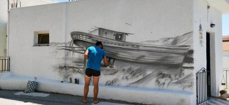 Και κάπως έτσι και χωρίς να το πάρουν χαμπάρι οι ντόπιοι ξεφύτρωσαν οι 3 πρώτες τοιχογραφίες στο στενάκι δίπλα από την ψαροταβέρνα. Ο Άλεξ με την αξιοζήλευτη ηρεμία που τον διακατείχε, παρέα με τον Μπιλι ενσάρκωσαν σε χρόνο dt την ασπρόμαυρη ξεθωριασμένη φωτογραφία από την οικογένεια που ποζάρει μπροστά στο νεόδμητο καράβι. Μιλώντας μόνο με τα μάτια και με φανταστικό επίπεδο αλληλοσυμπλήρωσης, οι δυο μεγάλοι καλλιτέχνες έκαναν το πρώτο μεγάλο δώρο στους κατοίκους του χωριού. Ένα τεράστιο καράβι που μόνο το θαλασσινό νερό του έλειπε για να χαρακτηριστεί αληθινό! Μαύρο, λευκό, δεκάδες αποχρώσεις του γκρι και πολλές ξύλινες υφές μεταμόρφωσαν τον γκρι σοβά σε ένα ξεχωριστό δημιούργημα!