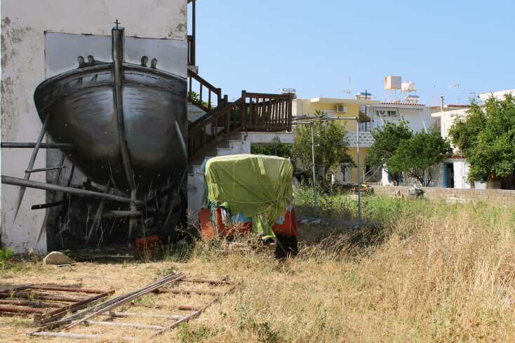 Με το καλωσόρισμα, φόρεσαν φανελάκια και βερμούδες της δουλειάς, έφτιαξαν σκαλωσιές, κουβάλησαν υλικά, και σύνεργα, κι’ άρχισαν με απίστευτη δεξιοτεχνία και ταχύτητα να μεταφέρουν στους τοίχους το παρελθόν του τόπου. Τους βλέπαμε σκαρφαλωμένους στις σκαλωσιές μέσα στο Αυγουστιάτικο λιοπύρι, με τις μάσκες και τα καπελάκια, σιωπηλούς και αθόρυβους, σεμνούς κι ευγενικούς, να τελετουργούν και ν’ αποκρυπτογραφούν την αρχέγονη τέχνη της ξυλοναυπηγικής, μέσα απ’ τη δική τους ταλαντούχα έκφραση. Κι αναρωτιόμασταν πώς γίνεται, άνθρωποι που δεν μύρισαν ποτέ ρετσινωμένο μαδέρι απ’ τον κορμό της Τραχείας πεύκης του βουνού, που δεν οσμίστηκαν την άψα του κατραμιού, της πίσσας, και του μίνιου, που δεν είδαν, και δεν άκουσαν την πριονοκορδέλα της μηχανής να κόβει κορμούς, συσσωρεύοντας λόφους πριονιδιού στη ξύλινη παράγκα του ταρσανά, που δεν έσκυψαν πάνω στο σανιδένιο πλάτωμα του σχεδιασμού των σκαριών, τη σάλα, να διακρίνουν τις γραμμές και τις καμπυλώσεις των νομέων, και του κορακιού, στο πλωριό ποδόσταμο, πώς γίνεται να αναπαριστούν με ακρίβεια, τις κουπαστές, τα τοξωτά ζωνάρια και τις σαϊτιές των γραμμών, των αγγελοκάμωτων καραβιών πάνω στην τραχιά λευκότητα τσιμεντένιων επιφανειών;