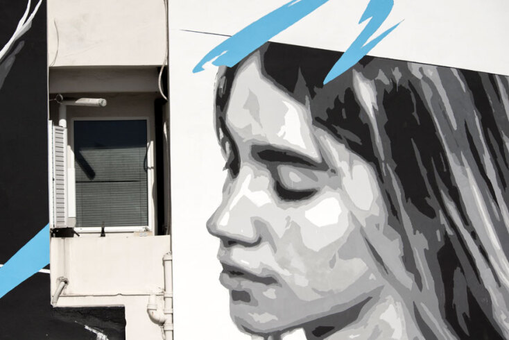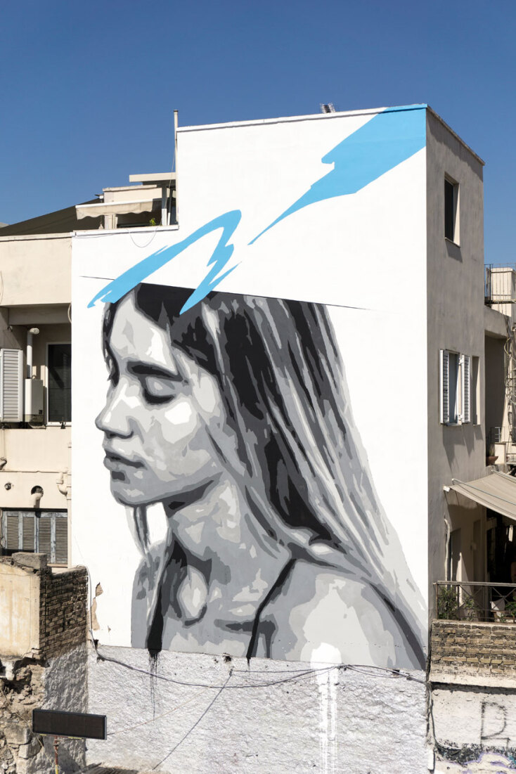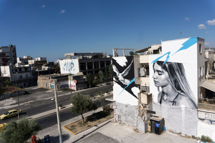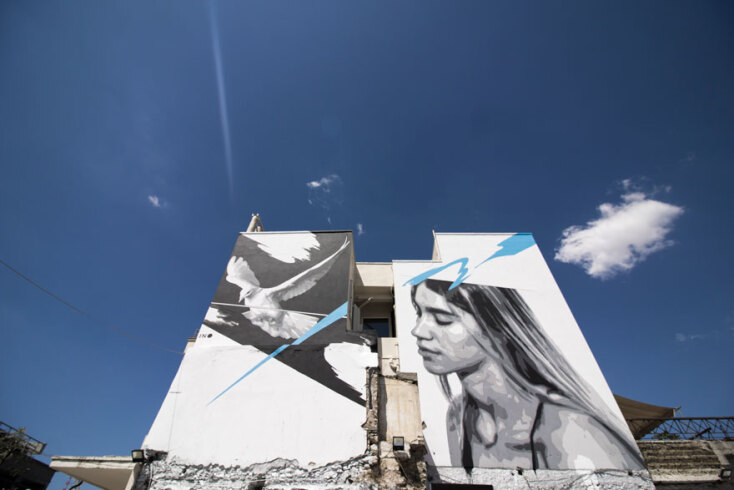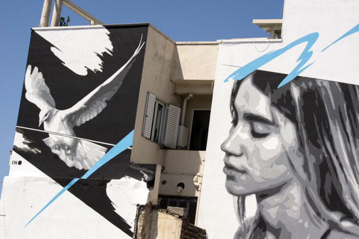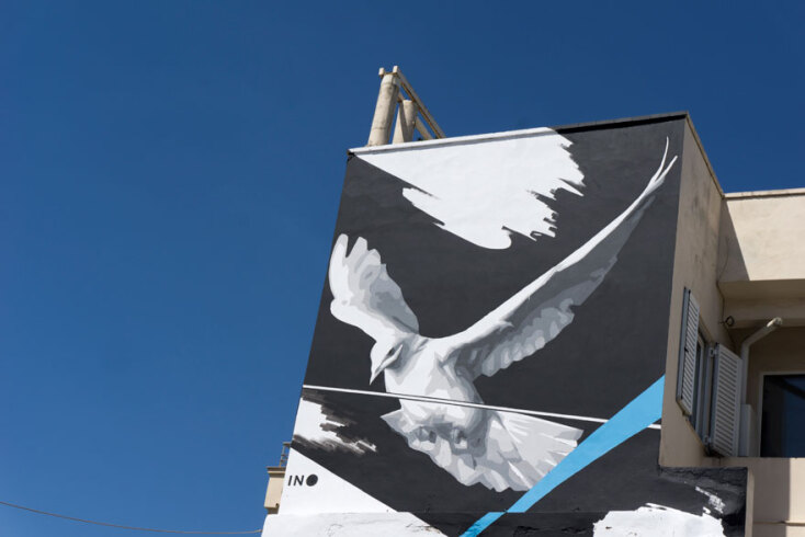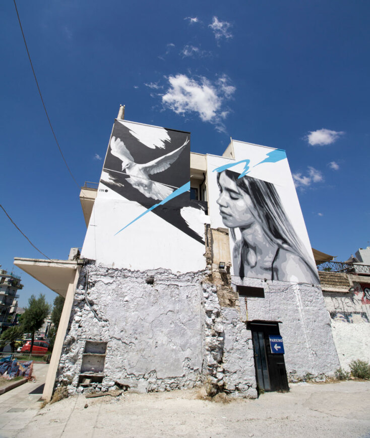 Η τοιχογραφία, που είναι φτιαγμένη στις δύο επιφάνειες ενός κτιρίου, απεικονίζει στη μία ένα κορίτσι με κλειστά μάτια και προς την κατεύθυνση που είναι στραμμένη, ενώ στην άλλη επιφάνεια απογειώνεται ένα λευκό περιστέρι. Η χαρακτηριστική γαλάζια πινελιά, που έχουν τα ασπρόμαυρα σχέδια του ΙΝΟ, αυτή τη φορά ξεκινάει από πάνω δεξιά (σημείο που συμβολίζει την αισιοδοξία) αλλά πηγαίνει προς τα κάτω αριστερά αφού περάσει απ’ το κεφάλι της κοπέλας. Σε κατεύθυνση εντελώς διαφορετική από αυτή του περιστεριού.