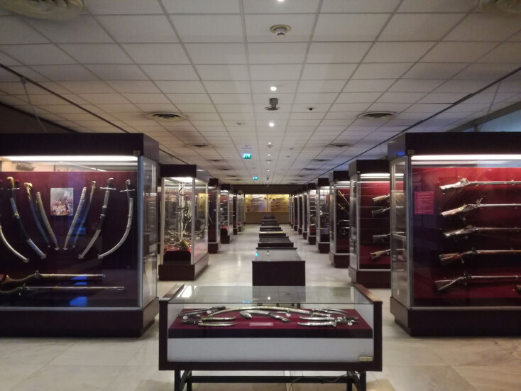 Όπως το εξωτερικό έτσι και το εσωτερικό του κτιρίου διακρίνεται για την μεγαλοπρέπεια, την αρχοντιά και τη λιτή του πολυτέλεια με την επιβλητική, υπέροχη μαρμάρινη σκάλα, η οποία οδηγεί στην Αίθουσα Κειμηλίων και στον πρώτο όροφο, να κυριαρχεί στον χώρο του ισογείου. Στους διαδρόμους με το καλογυαλισμένο και με γεωμετρικά σχέδια μωσαϊκό και τις κολώνες αριστερά και δεξιά, υπάρχουν εντυπωσιακά έπιπλα και καθρέφτες, προθήκες με όπλα και στους τοίχους απλίκες και πίνακες ζωγραφικής. Παντού κυριαρχεί μία αισθητική τάξη και ο επισκέπτης νιώθει ότι μπαίνει σε μία άλλη εποχή, εντελώς διαφορετική από τη σημερινή, αλλά ιδιαιτέρως γοητευτική και συναρπαστική.
