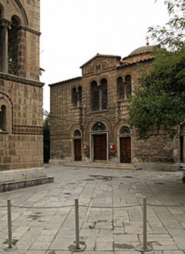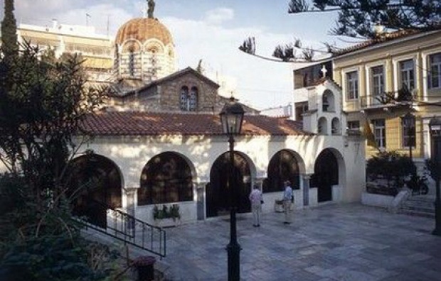 Υπέροχη αυλή με φοίνικες που φύτεψαν Σιναΐτες μοναχοί. Πιστοί από όλη την Αθήνα, μαζί και πολλοί τουρίστες. Χαιρέφωντος, Λυσικράτους, Γαλανού & Γκούρα