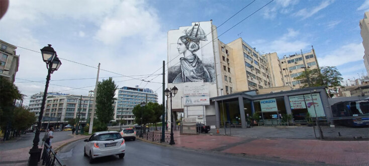 Στην Αγίου Κωνσταντίνου η κυκλοφορία των οχημάτων είναι ήπια. Πίσω μας βρίσκεται η πλατεία του Μεταξουργείου, ενώ στο αριστερό μας χέρι, καθώς ανηφορίζουμε, ξεπροβάλλει –ανάμεσα σε ετερόκλητου χαρακτήρα κτίρια– σαν ναυαγισμένο υπερωκεάνιο η Τραινοσέ. Μια εικόνα δυστοπική, που σπάει λίγα μέτρα πιο πάνω όταν –πάλι στο αριστερό μας χέρι– εμφανίζεται το υπέροχο κτίριο του Εθνικού Θεάτρου.