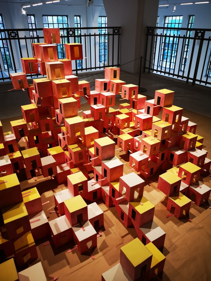 Το εμβληματικό κτίριο του πρώην Δημόσιου Καπνεργοστασίου, ένα χαρακτηριστικό, ανέπαφο στολίδι της βιομηχανικής αρχιτεκτονικής και του μοντερνισμού του 1930, είναι η μισή αρχοντιά της έκθεσης, ορθώνοντας προστατευτικά το ανάστημά του στην καρδιά μιας γειτονιάς που τα σπίτια της παραμένουν σε μεγάλο βαθμό χαμηλά ή εγκαταλειμμένα. Οι ζωηρές αποχρώσεις του κίτρινου και του κεραμιδί με τις οποίες είναι βαμμένες οι όψεις του και τα ανακαινισμένα καλογυαλισμένα μαρμάρινα δάπεδα αποπροσανατολίζουν ίσως τον επισκέπτη από την μακρά και πολύπαθη ιστορία του κτιρίου που είδε καπνοβιομηχανίες να ανθούν και να χάνονται σε στρόβιλους οικονομικών κρίσεων και πτωχεύσεων, που στέγασε στρατιωτικές υπηρεσίες και φυλακές την πρώτη περίοδο μετά την Απελευθέρωση (1945 – 1946) και λειτούργησε ακόμα και ως καταυλισμός προσφύγων τη δεκαετία του 1950. Όσο όμως πιο βαθιά εξερευνάς το κτίριο και τις παλιές βιομηχανικές πτέρυγες με στοιχεία μηχανολογικού εξοπλισμού να στέκονται σε γωνιές εν είδει αναθήματος και φρουράς της μνήμης του κτιρίου και να συνομιλούν με τη σύγχρονη τέχνη ανθρώπων από γωνιές του κόσμου που έχουν γνωρίσει όσο λίγες τον πόλεμο, τη φτώχια και τα δεινά τους, τόσο πιο πολύ αντιλαμβάνεσαι και αποκωδικοποιείς το μήνυμά του, τόσο περισσότερο ευδιάκριτα φτάνει στα αυτιά σου μέσα από την ευεργετική ησυχία ενός τέτοιου χώρου τέχνης η μακρινή ηχώ μιας μουσικής καμωμένης από φωνές εργατών, θορύβους μηχανών και βιαστικά βήματα ανθρώπων ασπρόμαυρων εποχών, σαν τα φιλμ με τα οποία μεγαλώσαμε. Δεν θα μπορούσε να βρεθεί χώρος πιο ταιριαστός για μια έκθεση που προσεγγίζει τα θέματα της συλλογικότητας, της πολιτιστικής κατανόησης της ιστορίας και της πολιτικής, του δημόσιου χώρου, και του κοινού μας παρελθόντος, παρόντος και μέλλοντος.