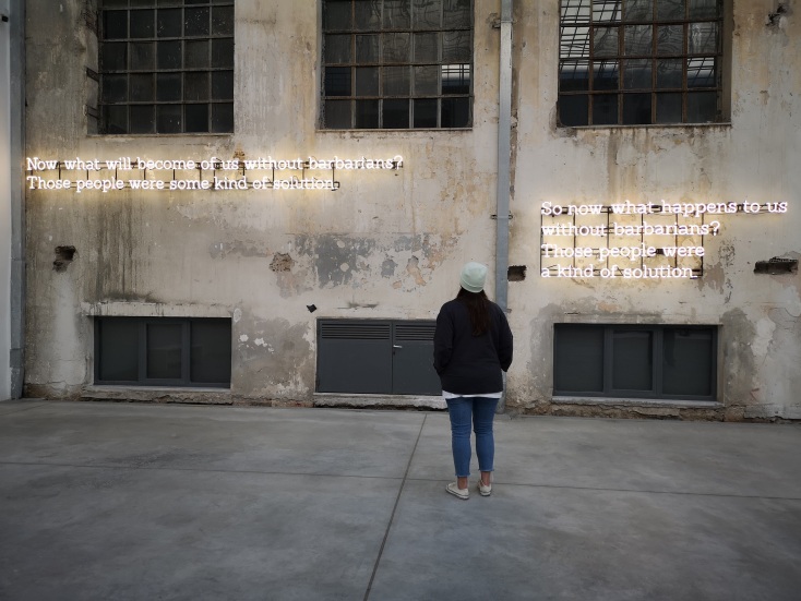 Το κεντρικό έκθεμα στην εσωτερική πρόσοψη του Καπνεργοστασίου, το neon installation “Waiting for the Barbarians” του Glenn Ligon -μια απευθείας ανάθεση του Οργανισμού ΝΕΟΝ στον aμερικανό εικαστικό- δεσπόζει στον αίθριο χώρο καλωσορίζοντας και αποχαιρετώντας τον επισκέπτη με τον πλέον εποικοδομητικό τρόπο. Είναι ίσως το πιο επιβλητικό και πολυφωτογραφημένο έκθεμα των “Portals” - και καθόλου άδικα. Οι εννέα επιγραφές neon με ισάριθμες αγγλικές μεταφράσεις των δύο τελευταίων στροφών από το ποίημα του Κωνσταντίνου Καβάφη «Περιμένοντας του Βαρβάρους» πλαισιώνουν την κεντρική εσωτερική πόρτα του Κανπεργοστασίου, ανοίγοντας η καθεμιά τη δική της πόρτα στην ερμηνεία της καβαφικής σύλληψης και στην εφαρμογή της σε ένα σήμερα υπό την διαρκή απειλή του ολοκληρωτισμού, στο οποίο οι «βάρβαροι» θα έπρεπε να έχουν πάψει προ πολλού να αποτελούν «μια κάποια λύση».