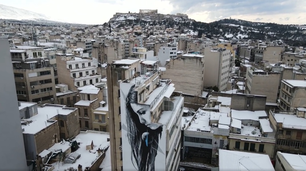 INO: Δείτε το εντυπωσιακό βίντεο που δημιούργησε ο street artist με τις τοιχογραφίες του τις ημέρες που η κακοκαιρία «Ελπίδα» έκανε κατάλευκη την Αθήνα.