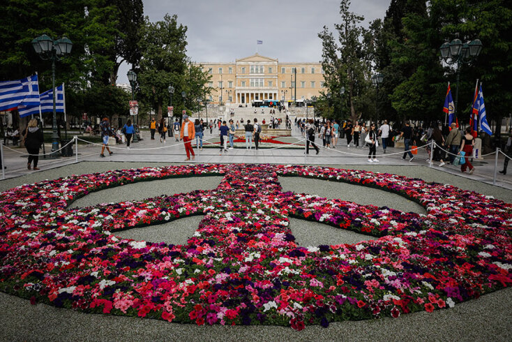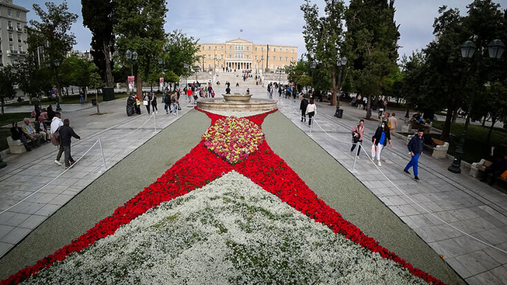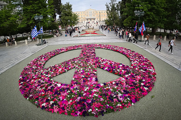 Λουλούδια στο Σύνταγμα για την Πρωτομαγιά 2022. Η εντυπωσιακή σύνθεση με το σήμα της ειρήνης στην πλατεία Συντάγματος.