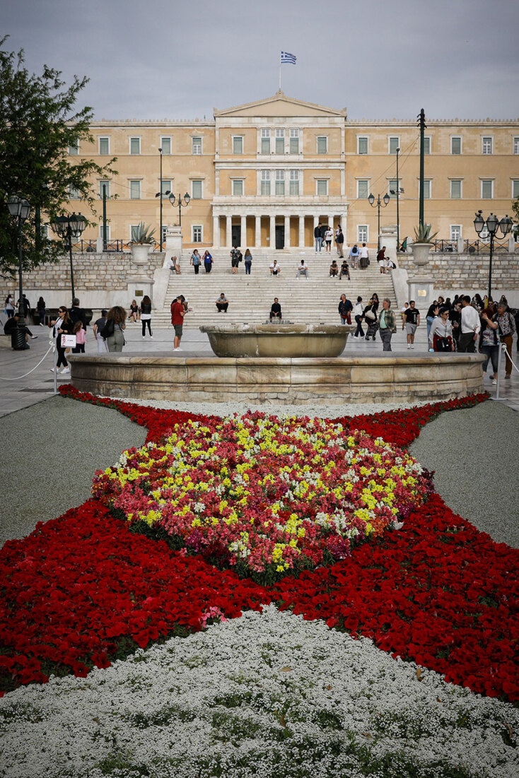 Εξίσου εντυπωσιακή είναι και η άλλη σύνθεση με λουλούδια στην πλατεία Συντάγματος. Και οι δύο συνθέσεις έχουν τραβήξει τα βλέμματα των περαστικών.