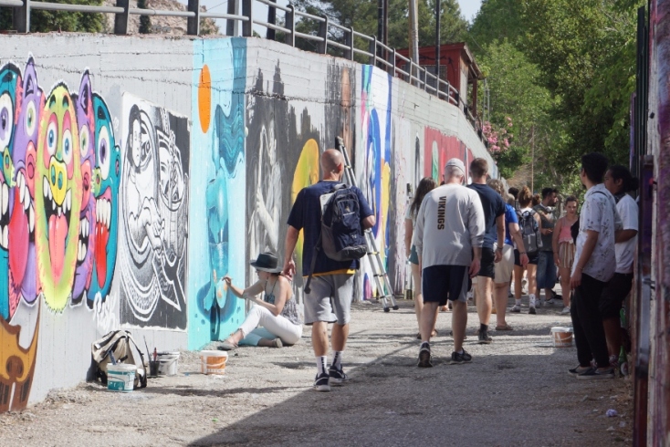 Σάββατο απόγευμα, λίγο μετά τις πέντε βρέθηκα να κοιτάζω πολύχρωμους «τοίχους με ιστορία» στο σχολικό συγκρότημα Εργάνης επί της οδού Ταταούλων. Καλλιτέχνες της street art και του graffiti, δημιούργησαν έργα, αντλώντας έμπνευση από τον πολιτισμό των Μικρασιατών προσφύγων: την μουσική, τη λογοτεχνία, τον χορό και τα κοινωνικά τους έθιμα, τιμώντας την επέτειο των 100 χρόνων από τη Μικρασιατική Καταστροφή. Στο Φεστιβάλ street art του Δήμου Βύρωνα που διεξήχθη το Σαββατοκύριακο 28-29 Μαΐου σε συνεργασία με την εταιρία Awesome Athens Experience μπορούσε να δει κανείς την χορευτική ομάδα Hobo IllusionerZ, να «κουνηθεί» στους ρυθμούς του μουσικού σχήματος «Οδός Αρμονίας», να νιώσει τα vibes από τους «Ρυθμούς του δρόμου official», να συμμετάσχει στα workshops, να δημιουργήσει τοιχογραφίες, stencil και να σιγοτραγουδήσει στίχους του Βασίλη Παναγιωτίδη.