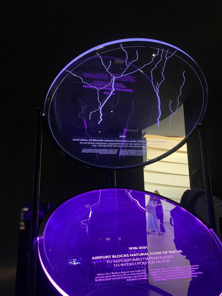 Tο σίγουρο είναι ότι όποιος και αν έρθει μαζί σου θα ξεκινήσετε από το Living a New Era κάτω από έναν επιβλητικό θόλο που αποτυπώνει τη ροή του αέρα, συνδέοντας την ιστορία του σημείου και αποτείνοντας φόρο τιμής στην αρχιτεκτονική του Saarinen. Σαν μικρό παιδί, μέσα στη δροσιά βάζεις δειλά δειλά τη παλάμη σου πάνω στις προβολές που περιλαμβάνουν μια αναδρομή στο παρελθόν του αεροδρομίου, βλέπεις τις βασικές αρχές του σχεδιασμού του The Ellinikon, τις υποδομές, τις εγκαταστάσεις που δημιουργούνται και το όραμα της ανάπλασης. Στριφογυρνάς γύρω από τη μεγαλύτερη κυκλική μακέτα που έχει δημιουργηθεί ποτέ στην Ελλάδα, συνολικού μεγέθους 45 τ.μ. για να εξερευνήσεις το Masterplan. Όσες φορές και να γυρνάς γύρω από την διαδραστική μακέτα, παρατηρείς και κάτι ακόμη: Απέραντο μπλε της θάλασσας και των περιοχών των κατοικιών, πράσινο της φύσης με το πάρκο, τους δημόσιους ανοιχτούς χώρους, χώρους πολιτισμού και αθλητισμού, γκρι της αστικής περιοχής, αποχρώσεις του μωβ για την φιλοξενία που θα βρεις, την εκπαίδευση, τα καταστήματα, ροζ για τα ψηλά και χαμηλά διατηρητέα κτίρια σαν ένα φαντασμαγορικό σόου που ζωντανεύει μπροστά σου.