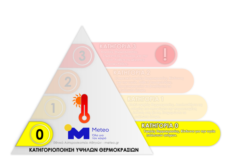 Υψηλό θερμικό φορτίο αναμένεται ιδιαίτερα και στην Αθήνα, με τις θερμοκρασίες να εντάσσονται στην κατηγορία 0 κατά τη διάρκεια της Πέμπτης, σύμφωνα με τη νέα κατηγοριοποίηση υψηλών θερμοκρασιών που εφαρμόζει πιλοτικά το meteo, σε συνεργασία με την επιστημονική επιτροπή του Arsht-Rock Resilience Center του ιδρύματος Atlantic Council, και τον Δήμο Αθηναίων.