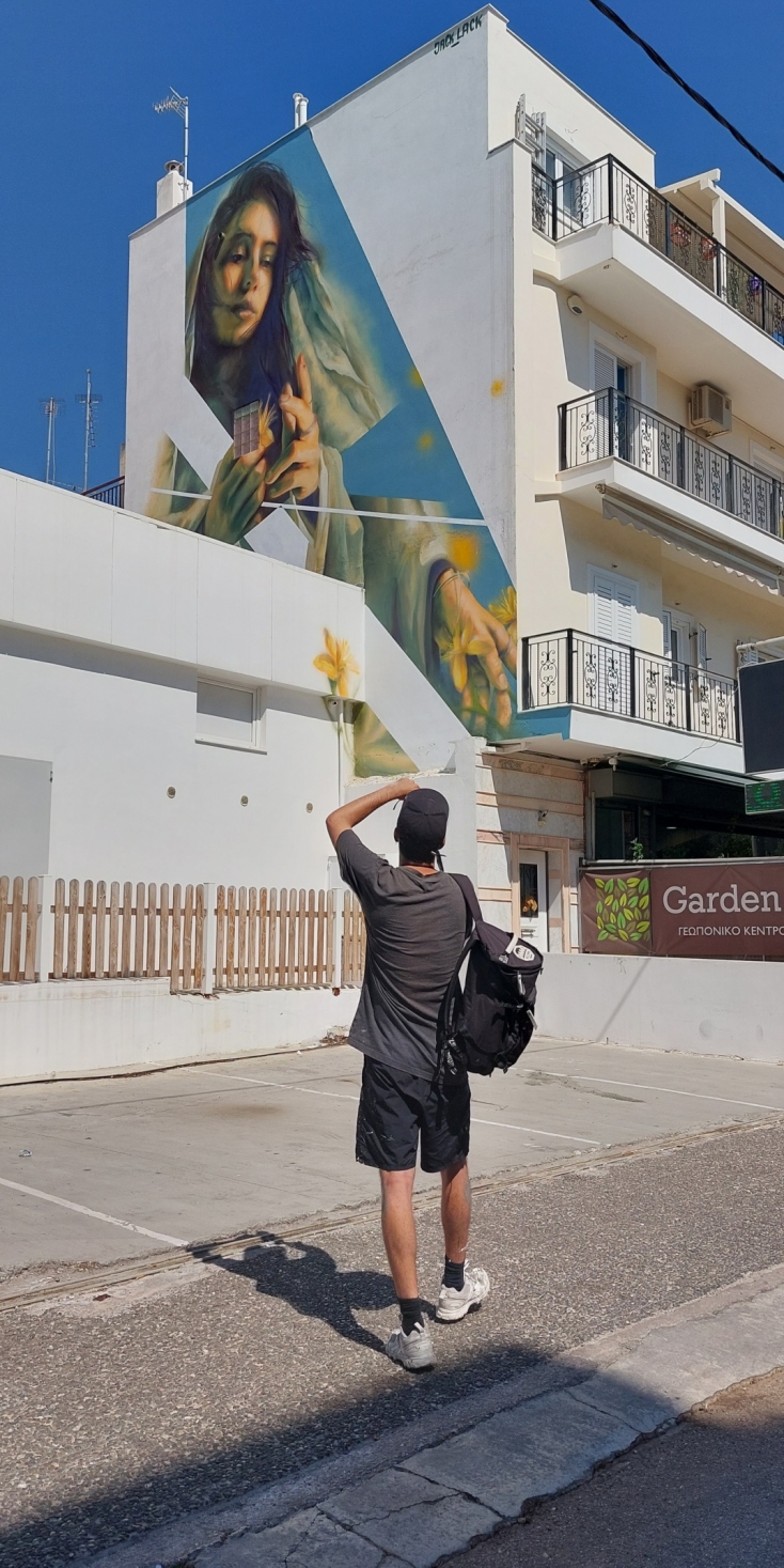 «Μια από τις δυσκολίες που αντιμετώπισα ήταν ότι είχαμε πολλά ακρυλικά χρώματα όπου σε συνδυασμό με τα λίγα σπρέι που διέθετα και το γεγονός ότι το budget μου δεν ήταν πολύ υψηλό, έπρεπε να αυτοσχεδιάσω αρκετά για να δημιουργήσω τα κατάλληλα χρώματα. Το δεύτερο πράγμα που με “εξέπληξε” ήταν η ένταση του ήλιου της Αθήνας που έκαιγε ανελέητα την πλάτη μου κατά τις απογευματινές ώρες όσο δημιουργούσα. Ωστόσο, λαμβάνοντας υπόψιν τον μικρό χρόνο προετοιμασίας, ήταν ένα από τα πιο ομαλά έργα αυτό το καλοκαίρι».