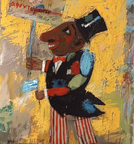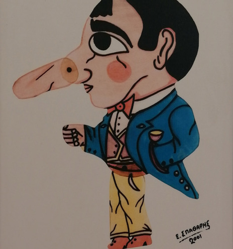 Το ταλέντο του μεγάλου καραγκιοζοπαίχτη εκφράστηκε και στον χώρο της ζωγραφικής, όπου διακρίθηκε ως ζωγράφος με πάρα πολλές ατομικές και ομαδικές εκθέσεις στο ενεργητικό του, τόσο στην Ελλάδα όσο και στο εξωτερικό. (Δείτε εδώ το εξώφυλλο που είχε φιλοτεχνήσει για την Athens Voice).