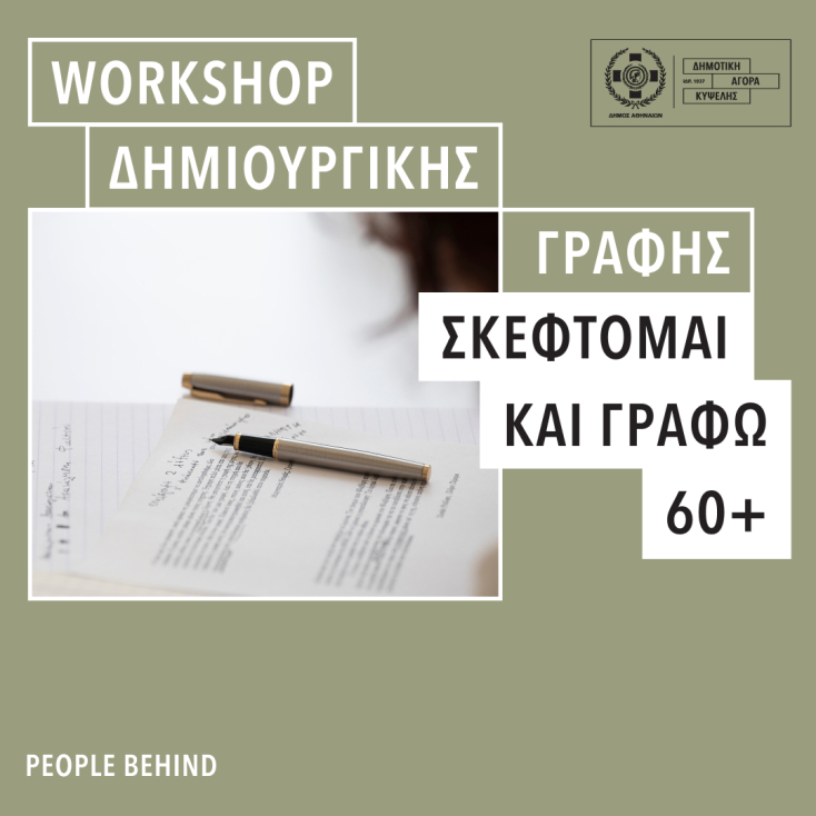 Μετά τους επιτυχημένους πρώτους κύκλους της άνοιξης και του καλοκαιριού, διοργανώνεται ξανά, σε συνεργασία με την ομάδα People Behind, η πρώτοτυπη σειρά εργαστηρίων για ανθρώπους ηλικίας άνω των 60 ετών, Σκέφτομαι και Γράφω. Σε αυτό το εργαστήριο θα μάθουμε τεχνικές γραφής, ώστε να μπορούμε να αφηγηθούμε μια ιστορία. Με τη χρήση εργαλίων όπως οι ασκήσεις δημιουργικής γραφής εμπλουτισμένες με τεχνικές νοητικής και συναισθηματικής χαρτογράφησης και τεχνικές ενίσχυσης της παρατηρητικότητας, θα μάθουμε να γράφουμε τη δική μας ή μια φανταστική ιστορία.
