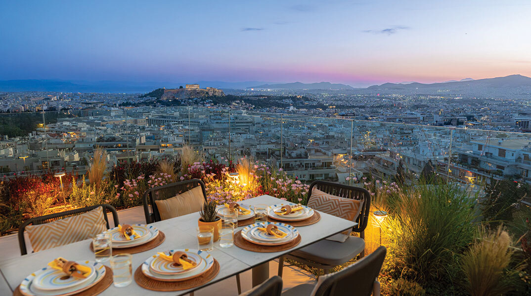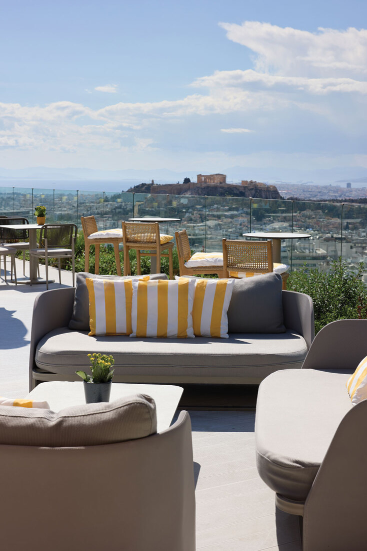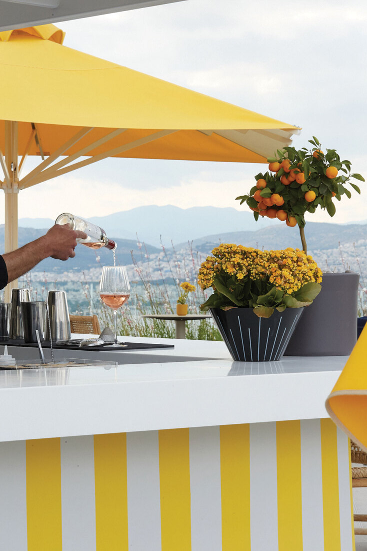 Τη νέα αρχιτεκτονική ταυτότητα του χώρου υπογράφει η in-house ομάδα του ξενοδοχείου, με επικεφαλής τη Μαρία Παπατριανταφύλλου, ενώ ο διεθνούς φήμης interior designer Carlo Mota από τη Νέα Υόρκη έχει αναλάβει την αισθητική επιμέλεια. Όλα είναι προσεγμένα στη λεπτομέρειά τους και η φιλοσοφία του σχεδιασμού εστιάζει στην ένωση του αστικού τοπίου με τη φυσική κομψότητα: τοπική μεσογειακή βλάστηση, αρωματικά φυτά και αποχρώσεις του ήλιου δημιουργούν μια urban όαση, με το πιο όμορφο ηλιοβασίλεμα της Αθήνας.
