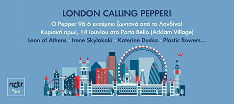 Ο Pepper 966 για μια μέρα, την Κυριακή 14/6, μεταφέρεται στην καρδιά του Λονδίνου και μεταδίδει ένα μαραθώνιο Greek’n Brit: συναντάει το κοινό του εκεί, Έλληνες που ζουν στο Λονδίνο και είναι Pepper fans, αλλά και Έλληνες μουσικούς και καλλιτέχνες, ζωγράφους και δημιουργούς που θα μεταφέρουν τις εμπειρίες τους, τις νέες τάσεις, το κλίμα που επικρατεί στην πόλη.