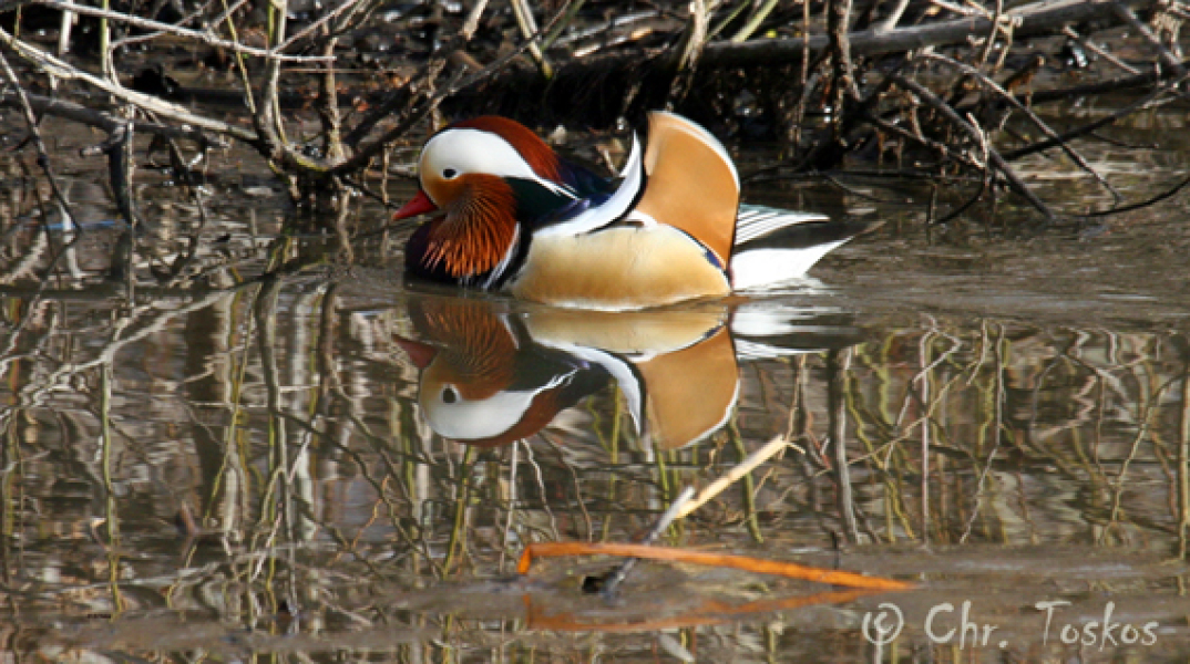 Ο επισκέπτης: ένας μανδαρίνος (aix galericatura), πάπια ασιατικής προέλευσης, η οποία πιθανότατα δραπέτευσε μαζί με άλλες πάπιες (όχι κατ’ ανάγκη του είδους της) από τον ευρωπαϊκό Βορρά.