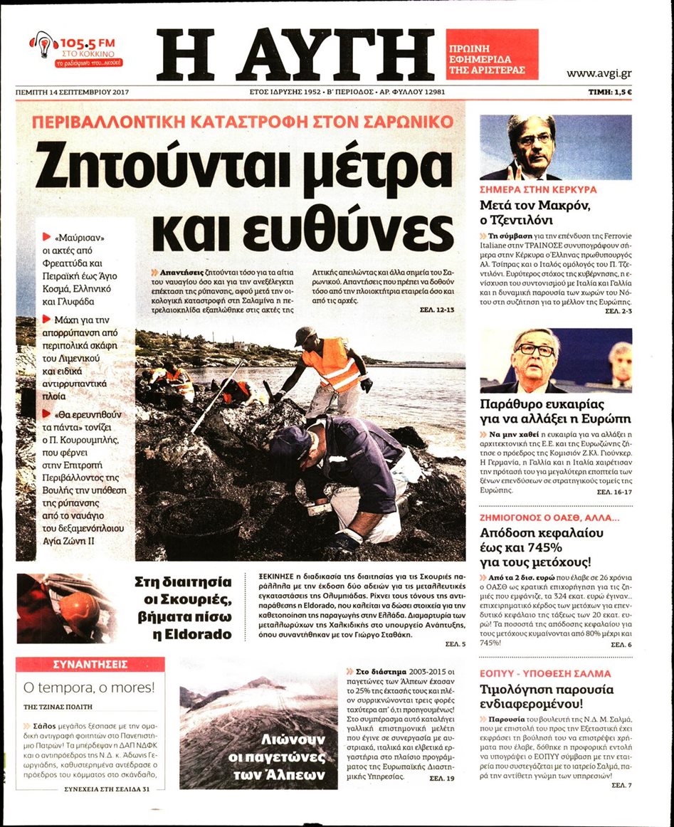 Εν τω μεταξύ, πληθαίνουν οι καταγγελίες για ολιγωρία της κυβέρνησης ακόμα και από την εφημερίδα Αυγή, η οποία στο σημερινό της φύλλο ασκεί δριμεία κριτική για τον συντονισμό και τις ενέργειες των συναρμόδιων υπουργείων σχετικά με την καταστροφή του Σαρωνικού. Χαρακτηριστικός είναι ο τίτλος του πρωτοσέλιδου του σημερινού της φύλλου στο οποίο αναγράφεται: «Ζητούνται μέτρα και ευθύνες».