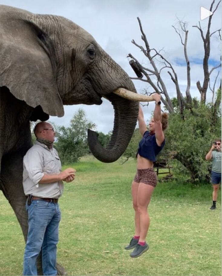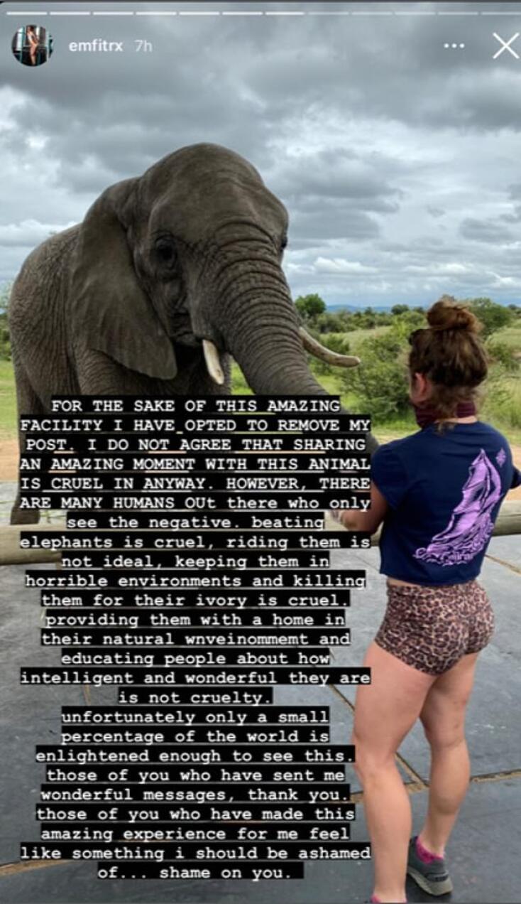 Άρον άρον κατέβασε την ανάρτησή της γυμνάστρια στη Νότια Αφρική, η οποία συνοδευόταν από μια φωτογραφία στην οποία κάνει ασκήσεις πάνω σε χαυλιόδοντες ελέφαντα.