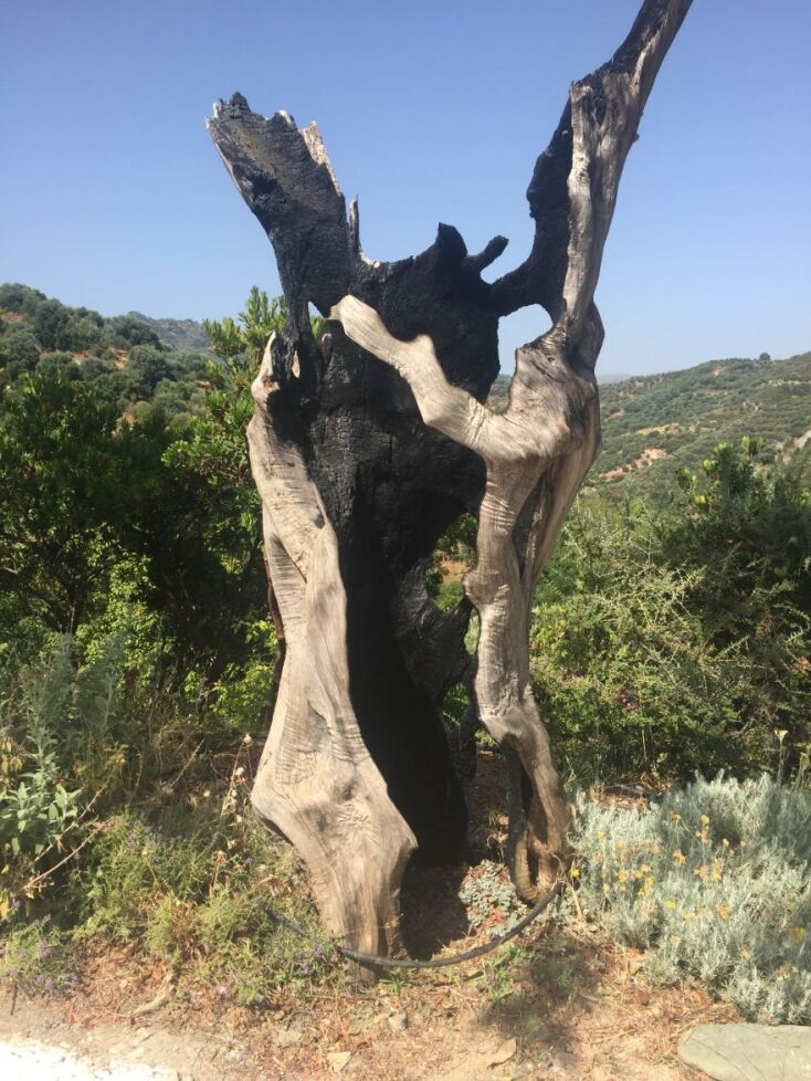 Δυσκολεύομαι να πιστέψω ότι ο παράδεισος αυτός ξεπήδησε μέσα από τις στάχτες μιας καταστροφικής πυρκαγιάς. «Μια φωτιά το 2003 μέσα σε 24 ώρες κατέκαψε μια τεράστια έκταση στο τόπο καταγωγής μου, στη Σκορδαλού αφήνοντας πίσω της μόνο στάχτες» λέει ο Πέτρος Μαρινάκης που, μαζί με το καμένο δάσος, αντίκρισε και τη δική του περιουσία να έχει καταστραφεί. «Η οικολογική και οικονομική καταστροφή για το χωριό ήταν ανυπολόγιστη. Περίπου 200.000 ελαιόδεντρα ενετικής περιόδου κάηκαν. Η φωτιά έκανε στάχτες και τη δική μας περιουσία» λέει ο κ. Μαρινάκης, που παρά την ανείπωτη θλίψη, η πρώτη του σκέψη ήταν πώς να «ξανανθίσει ο τόπος», πώς να αναγεννηθεί η γη τους.