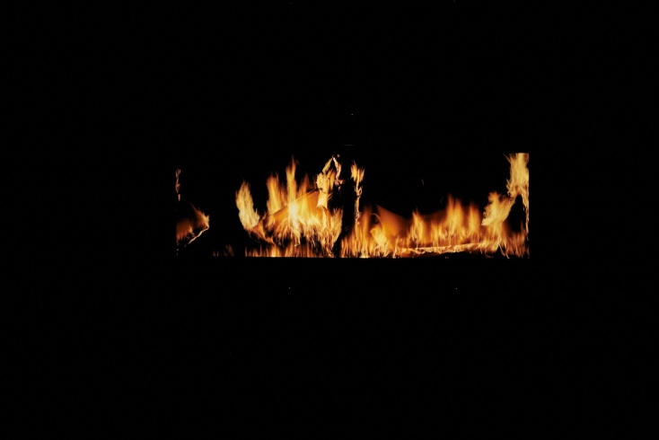 Το δάσος Merimbula κάηκε στην καταστροφική φωτιά του 2020 και στην απέναντι αίθουσα το «τοπίο» που συνθέτει η Δανάη Στράτου από φλεγόμενα χαρτιά ουρλιάζει. Όπως ούρλιαξαν τα πουλιά στον ουρανό, όπως φώναξε με τρόμο η ίδια η φύση της Αυστραλίας. Μπαίνω στην αίθουσα και με πιάνει η μυρωδιά του καμένου, η μυρωδιά που χαράχτηκε στη μνήμη μου μετά από τις φωτιές στη Βόρεια Εύβοια.
