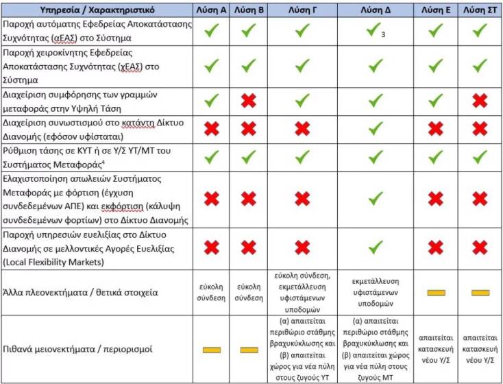 Το θέμα είναι καθαρά τεχνικό, καθότι εμπλέκονται διάφορες τεχνικές παράμετροι τόσο του Συστήματος Μεταφοράς όσο και του Δικτύου Διανομής. Στον ακόλουθο πίνακα γίνεται μία προσπάθεια να καταγραφούν τα ειδικά χαρακτηριστικά κάθε πιθανής λύσης, καθώς και τα πλεονεκτήματα και μειονεκτήματα αυτών, λαμβάνοντας φυσικά υπόψη τους περιορισμούς έγχυσης που αναμένεται να επιβάλουν ο Διαχειριστής του Συστήματος Μεταφοράς (ΑΔΜΗΕ) και ο Διαχειριστής του Δικτύου Διανομής (ΔΕΔΔΗΕ) στους σταθμούς αποθήκευσης με μπαταρίες που συνδέονται στο Σύστημα Μεταφοράς και το Δίκτυο Διανομής, αντίστοιχα.