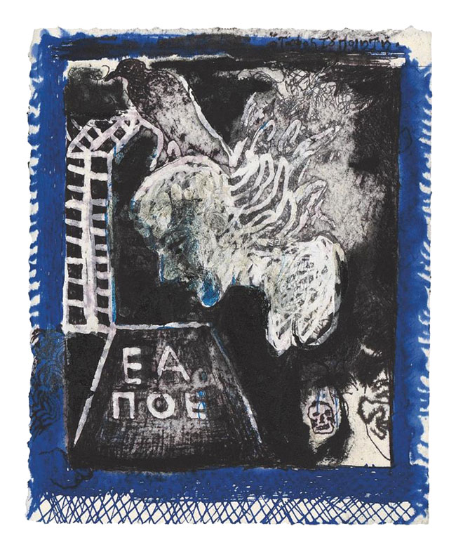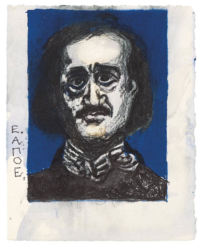 «Το κοράκι του Έντγκαρ Άλαν Πόε». Τι έκθεση! «Κάποια φορά, μεσάνυχτα, ενώ εμελετούσα κατάκοπος κι αδύναμος ένα παλιό βιβλίο μιας επιστήμης άγνωστης, άκουσα έναν κρότο σα να χτυπούσε σιγανά κανείς στην ξώπορτά μου». Δυο μεγάλα ποιήματα του σκοτεινού βαθέως ρομαντισμού μαυροφτερουγίζουν με μελάνια, σχέδια και χαρακτικά. Εξπρεσιονιστικά, ζωγραφικά, συνδέουν καλλιτέχνη Μαντζαβίνο και ποιητή Πόε σαν μια υπαρξιστικής αναζήτησης ανταλλαγή συναισθημάτων, σαν ένας διάλογος-αναπαράσταση με το διάσημο Μαυροπούλι σε ρόλο αγωγού. Σαν μια υπόσταση. Και στο παιχνίδι ανάμεσά τους παρεισφρέει κι ο Μαλαρμέ, που κι αυτός κάποτε με το «Ο τάφος του Έντγκαρ Άλαν Πόε» πέταξε μαζί του, πετάει μαζί τους. Ένα άνοιγμα στην αιωνιότητα, μια εικαστική dark wave σχεδίαση, που θα μπορούσε άνετα να πωλείται, πέρα από τη βιβλιοθήκη του ΜΙΕΤ, ως και στην πλατεία Ναβαρίνου, που ακόμα τα κορίτσια ψάχνουν για μπλουζάκια με τον Μπράντον Λι και τα αγόρια με το ρίμελ στα μάτια φορούν στάμπες Nine Inch Nails.