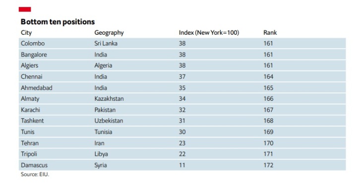 Οι φθηνότερες πόλεις στην κατάταξη του Economist Intelligence Unit είναι η Δαμασκός, η Τρίπολη και η Τεχεράνη, κάτι που αντικατοπτρίζει τις αδύναμες οικονομίες και τα αδύναμα εθνικά νομίσματα. Η Δαμασκός και η Τρίπολη, που «συχνάζουν» στην κατάταξη με τις πιο φθηνές πόλεις, κατέγραψαν μέτριο πληθωρισμό σε τοπικό νόμισμα το περασμένο έτος. Η Τεχεράνη είναι πλέον η τρίτη φθηνότερη πόλη στη συγκριτική κατάταξη, ενώ πέρυσι βρέθηκε πολύ ψηλότερα.