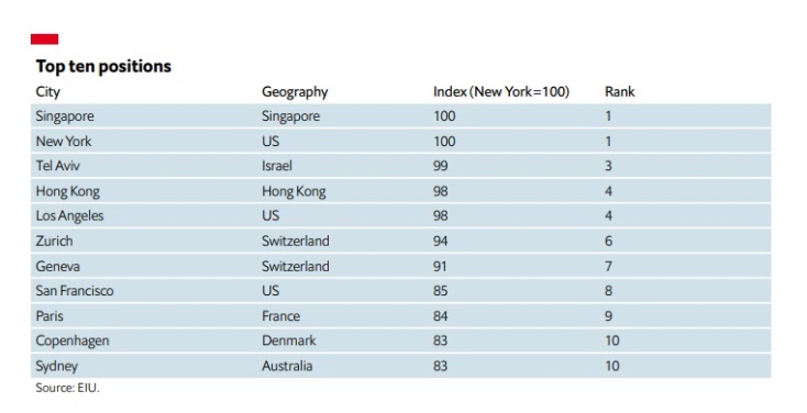 Οι δύο αυτές πόλεις κατάφεραν να εκθρονίσουν το Τελ Αβίβ που το 2021 βρέθηκε στην πρώτη θέση της κατάταξης, αλλά φέτος υποχώρησε στην τρίτη θέση. Ο λόγος που έπεσε είναι τα ισχυρότερα νομίσματα και ο υψηλότερος ρυθμός πληθωρισμού που ισχύουν για τη Νέα Υόρκη και τη Σιγκαπούρη. Την κορυφαία πεντάδα των ακριβότερων πόλεων συμπληρώνουν το Χονγκ Κονγκ και το Λος Άντζελες.