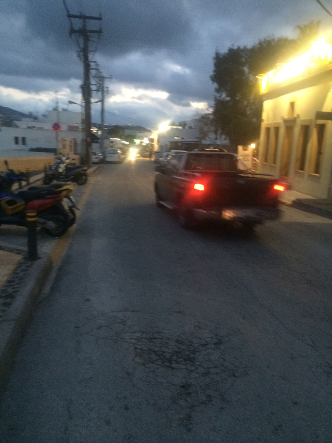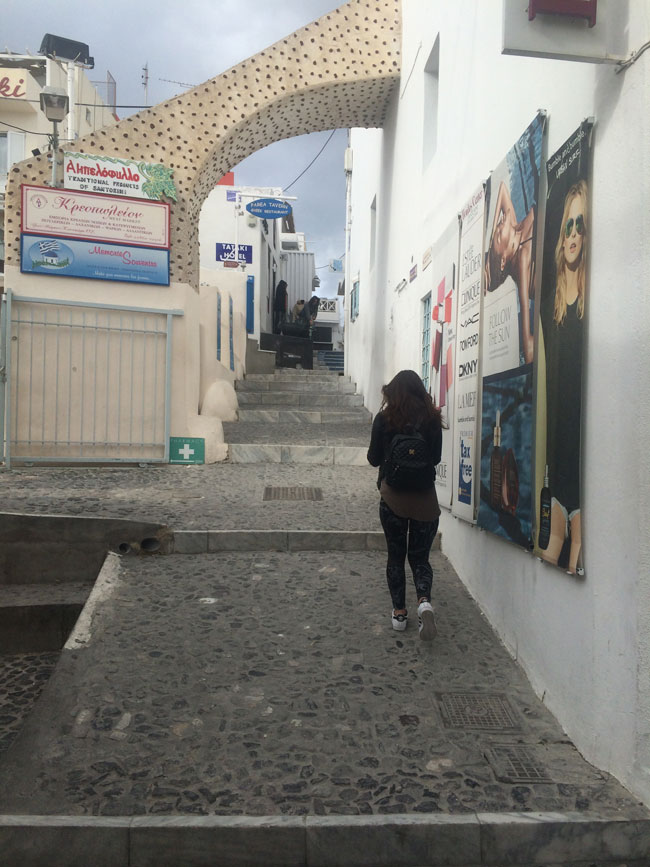 Το νησί σαν ασπρόμαυρο όνειρο. Τα χρώματα βυθισμένα ακόμη στην αγκαλιά του ηφαιστείου. Τα σοκάκια των ποδοβολητών σε χειμερία νάρκη. Σποραδικοί Κινέζοι τουρίστες διασχίζουν βιαστικά πού και πού. Ανηφορίζουν στην κορυφή.