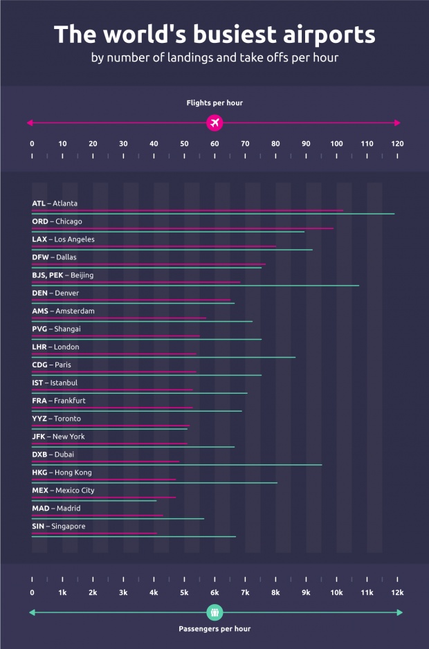 Η BuiltVisible δημιούργησε ένα ενδιαφέρον γράφημα με βάση τα στοιχεία της Lastminute.com, που κατατάσσει τα πιο πολυσύχναστα αεροδρόμια στον κόσμο με τον αριθμό των απογειώσεων και προσγειώσεων ανά ώρα, καθώς και τον αριθμό των επιβατών που κάθε αεροδρόμιο μεταφέρει στον ανάλογο χρόνο.