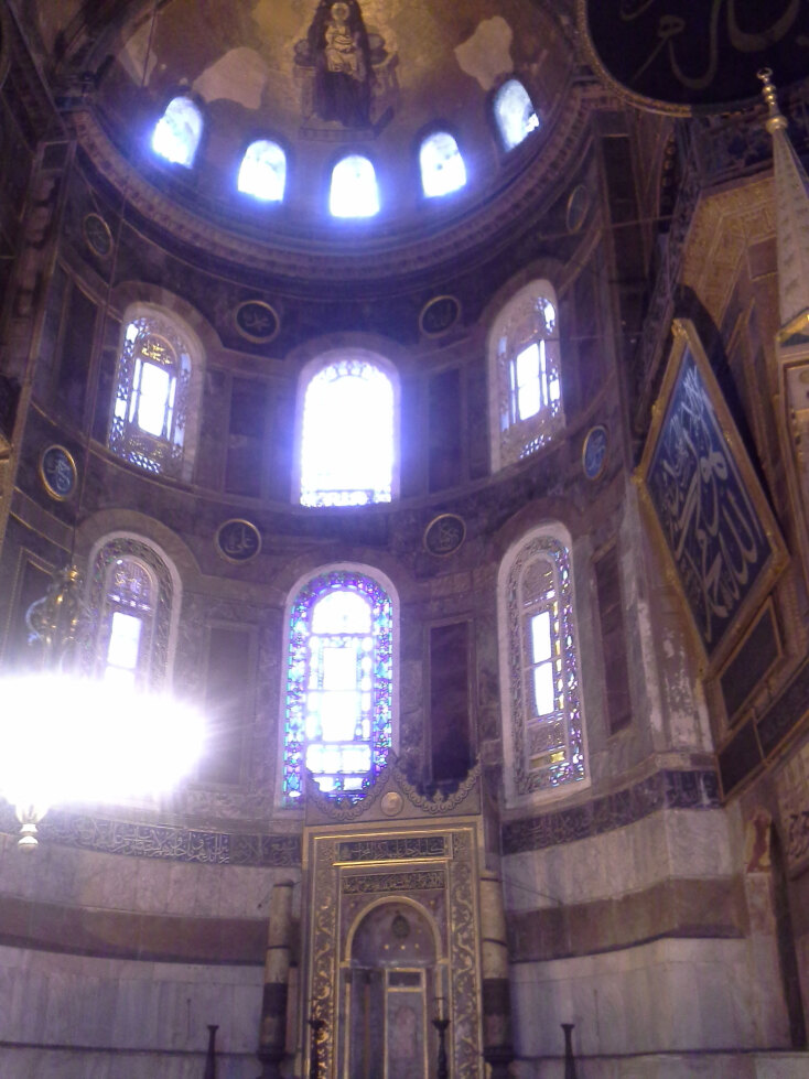 Η Αγια-Σοφιά μοιάζει ατελείωτη. Παντού τρούλοι, μοναδική αρχιτεκτονική. Καμία κολόνα να στηρίζει τον κεντρικό τρούλο, ύψους 56 μέτρων. Νιώθεις τόσο μικρός. Ένα τίποτα. Τα 40 παράθυρα τραβούν το φως αβίαστα μέσα στον ναό και τον λούζουν με ήλιο. Σαν, εκεί, να ήταν η πρώτη του κατοικία.