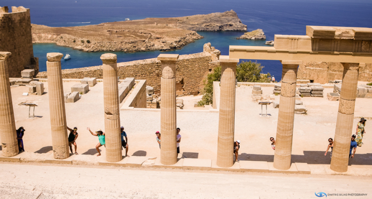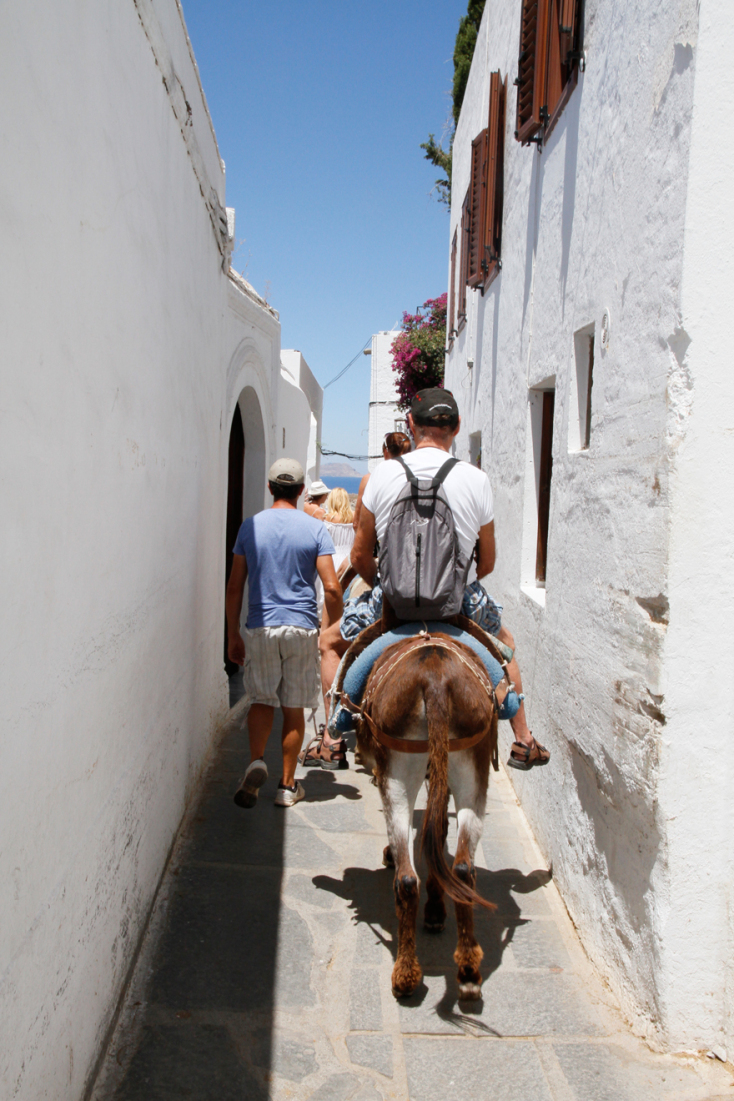 Θα το έχετε δει σε φωτογραφίες (ή σε ημερολόγιο τοίχου): η Ακρόπολη, χτισμένη από τους Ιωαννίτες Ιππότες στην κορυφή του βράχου, κουκλίστικη, η άσπρη μίνι πολιτεία γύρω της, η καρτ-ποσταλική παραλία, τα ψηφιδωτά στις αυλές (τσούκου τσούκου με ατελείωτα χρωματιστά βοτσαλάκια), τα στενά δρομάκια, οι γλάστρες, οι βεραντούλες πάνω στη θάλασσα… Ό,τι και να πω, είναι λειψό – με πέντε φωτογραφίες της Λίνδου, τινάζονται όλες οι γραπτές περιγραφές στον αέρα.