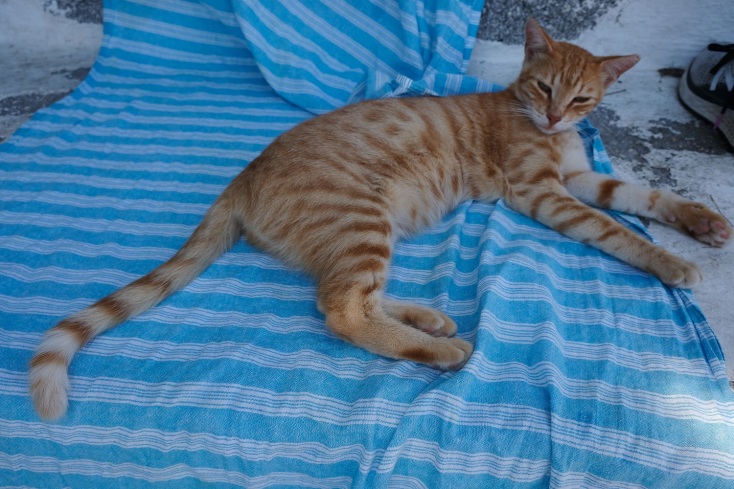 Είναι πολύ πιθανό, μόλις απομακρυνθείς από την πετσέτα σου για να μπεις στο νερό, να ξαπλώσει πάνω της αυτάρεσκα και με θράσος ένα από τα γατιά της παραλίας. Αυτά είναι αμέτρητα, καλοζωισμένα και πολύ κοινωνικά. Εδώ, στις τσιμεντένιες προβλήτες που τις ενώνουν επίσης τσιμεντένιοι διάδρομοι, περιφέρεται και μια οικογένεια πάπιες. Σεριανίζουν σεινάμενες κουνάμενες από την μια προβλήτα στην άλλη, κοιτώντας τους ανθρώπους και τις γάτες όλο περιέργεια και κουτσομπολεύοντας μεταξύ τους. Ω ναι, είμαι σίγουρος ότι μας κουτσομπολεύουν.