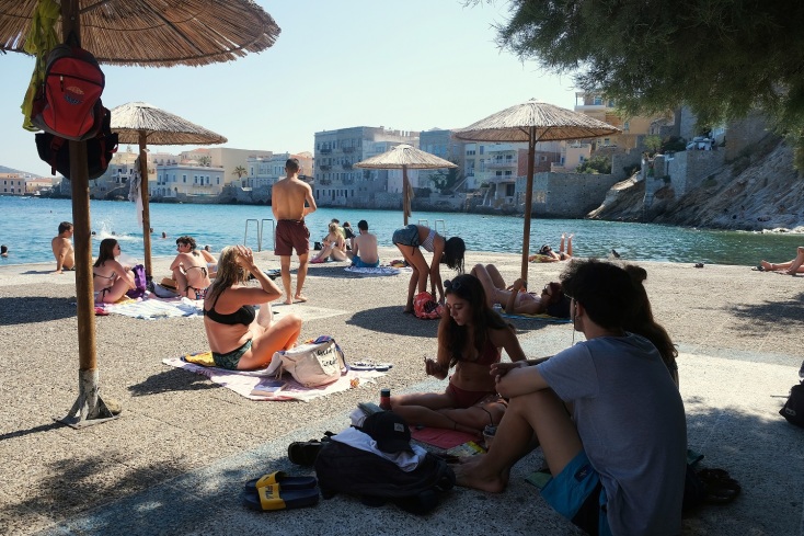 Φέτος, επιτέλους, ανακάλυψα την απόλυτη «αστική παραλία» στην Ελλάδα, και μάλιστα σε έναν τόπο που αγαπώ πολύ: την Ερμούπολη. Οι προηγούμενες επισκέψεις μου στην Σύρο δεν με είχαν οδηγήσει στα «Αστέρια» – μια σειρά τσιμεντένιες εξέδρες στην ακτογραμμή, κάτω από την συνοικία Βαπόρια. Η πρόσβαση γίνεται μέσω της σκάλας, απέναντι ακριβώς από το ιερό του Αγίου Νικολάου, που διακλαδίζεται στην πλαγιά ανάμεσα σε θάμνους και αρμυρίκια. Η περιοχή κάποτε ονομαζόταν «Παυσίλυπον», σημειώνει ο Μάνος Μαστοράκης (34), που μεγάλωσε στην Αθήνα αλλά εδώ και ένα χρόνο περίπου κατοικεί μόνιμα στην Ερμούπολη.