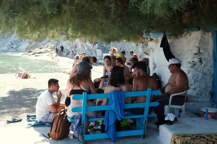 Μπροστά στο δωματιάκι, όμως, θα βρεις πάντα μια παρέα να κάθεται στο παλιό, ξύλινο παγκάκι, βαμμένο γαλάζιο όπως και το μικρό ξύλινο τραπέζι, και τις λευκές πλαστικές καρέκλες. Είναι η παρέα του Λάκη, φίλοι και γνωστοί του διαφόρων ηλικιών. Συχνά παίζουν τάβλι, ενώ ακούν μουσική από ένα τεράστιο, παλιό κασετόφωνο. Είναι μια εικόνα που σε γυρίζει δεκαετίες πίσω, σε μια Ελλάδα που έχει χαθεί. Δεκαετίες πίσω σε γυρίζει και η μουσική, πάντα νοσταλγική, πάντα σε χαμηλή ένταση. Πολλές φορές βάζουν και κλασική μουσική, ιδίως προς το ηλιοβασίλεμα. «Ο Λάκης έβαζε, θυμάμαι, Πάριο, στον γυαλό πετούν οι γλάροι και τέτοια» θυμάται η Δέσποινα. Οι φίλοι και γνωστοί του συνεχίζουν στο ίδιο τέμπο. Καμμιά φορά, εμφανίζεται ένας νέος που παίζει κιθάρα και οι άλλοι σιγοτραγουδούν.