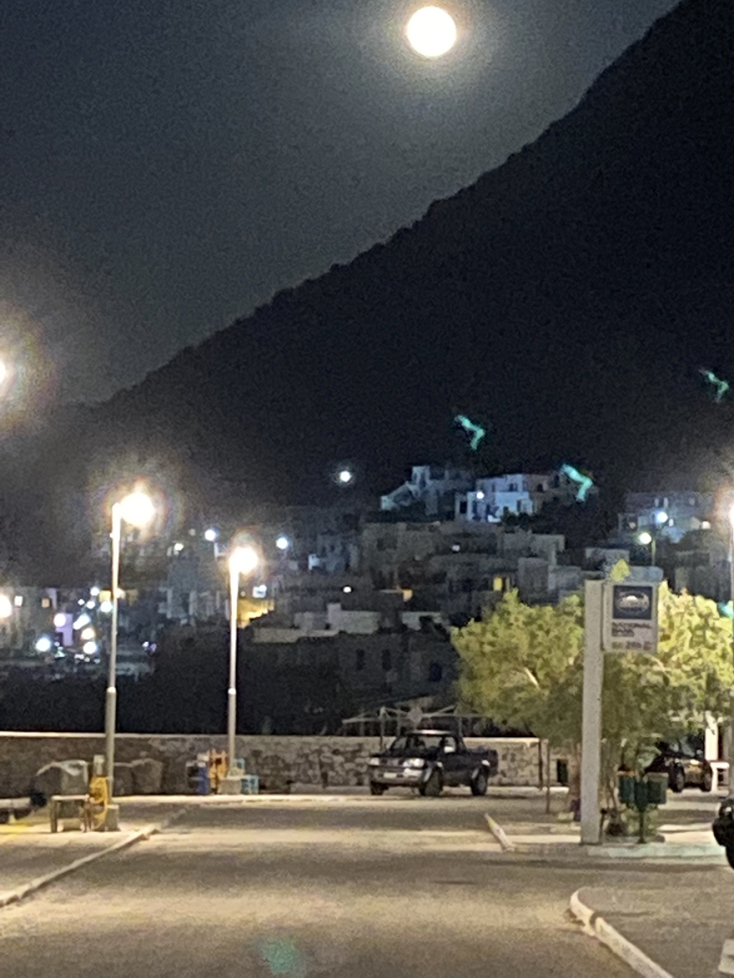 Έφτασα βράδυ με την μάσκα σφιχτοδεμένη. Νεκρική σιγή. Έχω τη τύχη να ταξιδεύω, στην Ελλάδα απο άκρη σε άκρη σε ανύποπτους χρόνους, χειμώνα - καλοκαίρι κυρίως για δουλειά. Ακόμη και τώρα χωρίς περιορισμούς. Δουλειά μου είναι η φροντίδα μικρών και μεγάλεων πόλεων, νησιών, δρόμων, πλατειών και γειτονιών. Δεν με περίμενε κανείς. Ήμουν μόνος σε ένα σκοτεινό λιμάνι, σε ένα γοητευτικό νησί. Το καράβι είχε αργήσει απελπιστικά. Οι επιβάτες είχαν εξαφανιστεί βιαστικά στους δρόμους της ζωής τους. Της μοναξιάς ή της συντροφιάς. Εγώ ξένος επισκέπτης. Ήταν περασμένες 10 το βράδυ. Μόνη δική μου συντροφιά το αστραφτερό φεγγάρι γεμάτο, σαν τελειότητα της γεωμετρίας του ουρανού. Μία ελάχιστη έκπληξη.