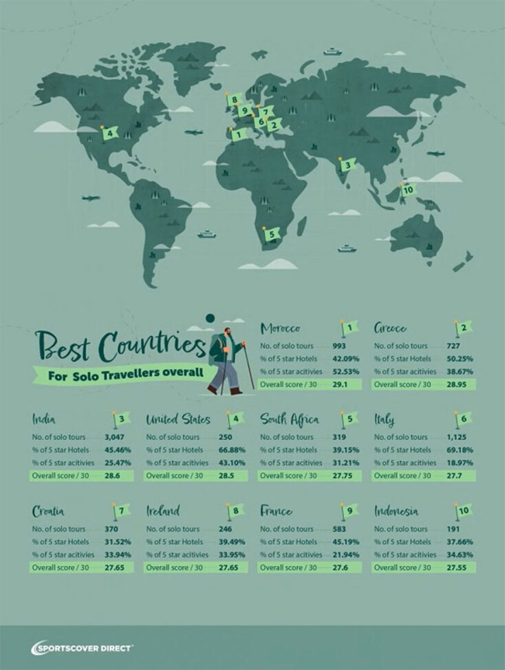 Λαμβάνοντας υπόψιν τον αριθμό των μεμονωμένων ταξιδιών, το ποσοστό των 5άστερων ξενοδοχείων και το ποσοστό των δραστηριοτήτων με 5 αστέρια στο TripAdvisor, το SportsCover Direct τονίζει ότι η Ελλάδα βρίσκεται στη δεύτερη θέση του Top10 με τις χώρες που είναι οι καλύτερες για «solo» ταξίδια, συγκεντρώνοντας 28.95/30 βαθμούς.