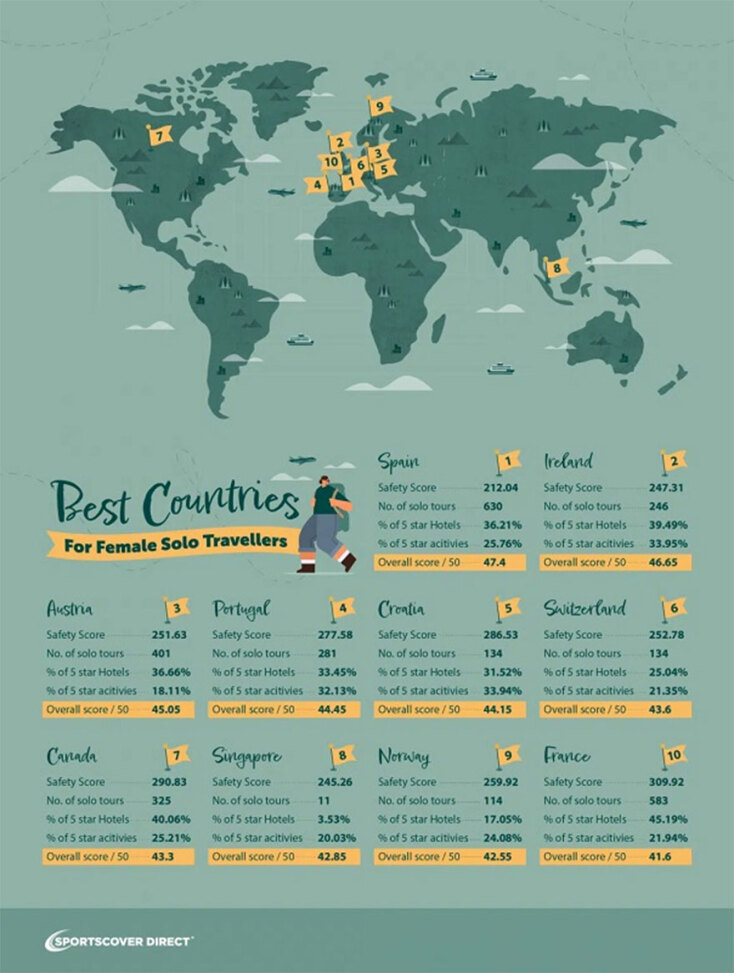Την ίδια στιγμή το SportsCover Direct παρουσιάζει και τις 10 χώρες που είναι οι καταλληλότερες για γυναίκες οι οποίες ταξιδεύουν μόνες τους. Στην κορυφή βρίσκεται η Ισπανία με 47.4/50 βαθμούς. Η συγκεκριμένη χώρα θεωρείται η ασφαλέστερη και υποδέχεται κάθε χρόνο τον μεγαλύτερο αριθμό γυναικών που ταξιδεύουν μόνες τους. Ακολουθεί η Ιρλανδία με 46.65/50. Τρίτη η Αυστρία, τέταρτη η Πορτογαλία και Πέμπτη η Κροατία.
