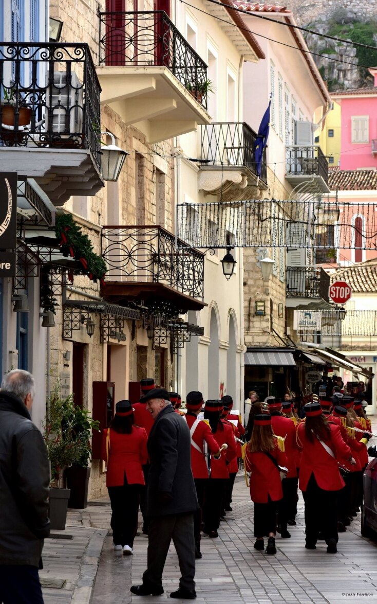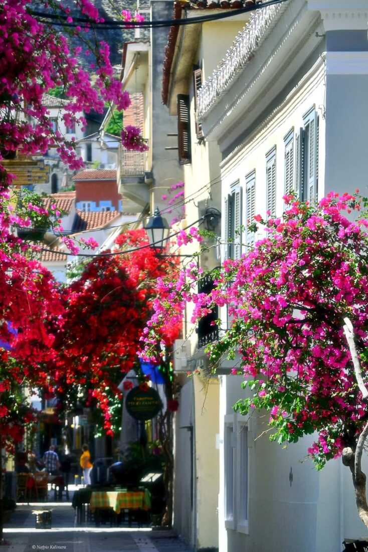 Οι ανθισμένες βουκαμβίλιες πρωταγωνιστούν σε κάθε σοκάκι. Οι αυλές ασπρίζουν και οι γλάστρες τους φρεσκοβάφονται. Στα παλιά αρχοντικά τα παράθυρα μένουν διάπλατα με κόκκινα λάβαρα στα μπαλκόνια τους και μέσα από τα σπίτια βγαίνουν μυρωδιές από πασχαλινά κουλούρια και αφράτα τσουρέκια που ψήνονται. Ολόκληρο το Ναύπλιο ετοιμάζεται για το Πάσχα.