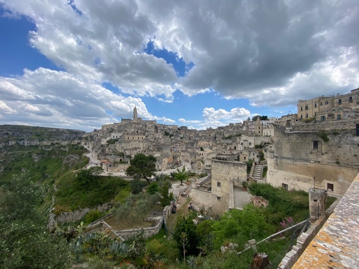 Την επόμενη ημέρα επισκεφθήκαμε τη Ματέρα, μια πανάρχαια πέτρινη πόλη χιλιάδων ετών που έχει φιλοξενήσει σετ ταινιών όπως «Τα πάθη του Χριστού» του Μελ Γκίμπσον και άλλες. Ο καιρός ήταν ιδανικός, με λίγη δροσιά, λίγα σύννεφα και λίγη ηλιοφάνεια. Περπατήσαμε όσο αντέχαμε, έχοντας πια συσσωρευμένη κούραση, και ξαποστάσαμε το μεσημέρι σε ένα τύπου ιταλικό μπιστρό όπου ένας ιδιαίτερος Ιταλός ιδιοκτήτης του εστιατορίου με πολλή προσωπικότητα μας υποδέχθηκε με χαμόγελο και διάθεση και μας έφερνε το ένα υπέροχο πιάτο μετά το άλλο. Όταν μας ρώτησε από που είμαστε και του είπαμε από Ελλάδα μας είπε πόσο συχνά πηγαίνει, πόσο την αγαπά, και πως οι παραλίες ο καιρός και οι άνθρωποί της την κάνουνε το καλύτερο μέρος στον κόσμο. Μετά, με το αριστερό του χέρι, ανέβασε λίγο το μανίκι του για να μας δείξει ένα τατουάζ στον δεξί του πήχη εμπνευσμένο από κάτι ελληνικό.