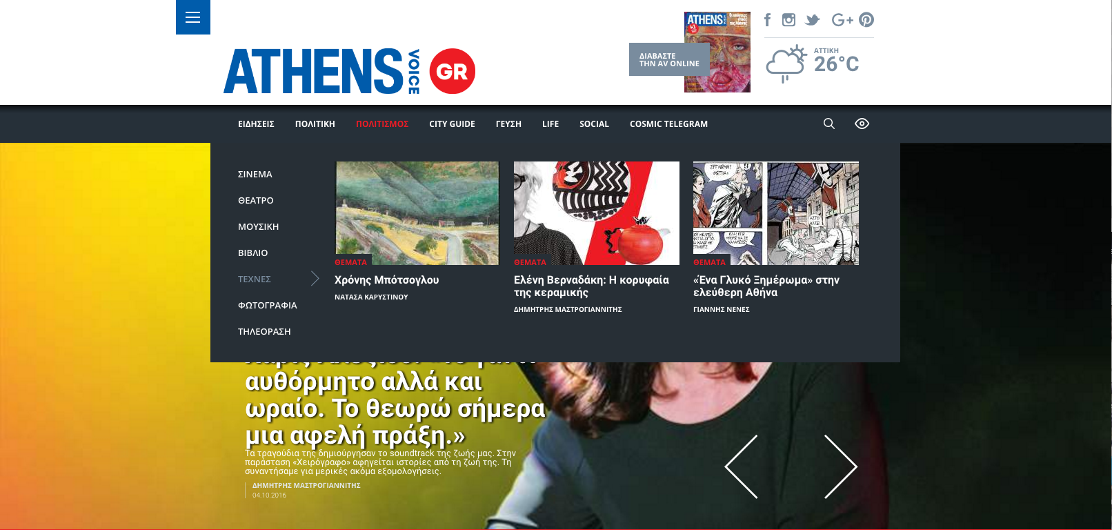 Η ATHENS VOICE, το Νο 1 free press της Αθήνας, συμπληρώνει σε λίγες μέρες 13 χρόνια αδιάκοπης παρουσίας στους δρόμους της πόλης. Το ολοκαίνουργιο, ανανεωμένο της site με νέο look, νέες λειτουργίες και ακόμα πιο ενδιαφέρον περιεχόμενο είναι ήδη εδώ.
