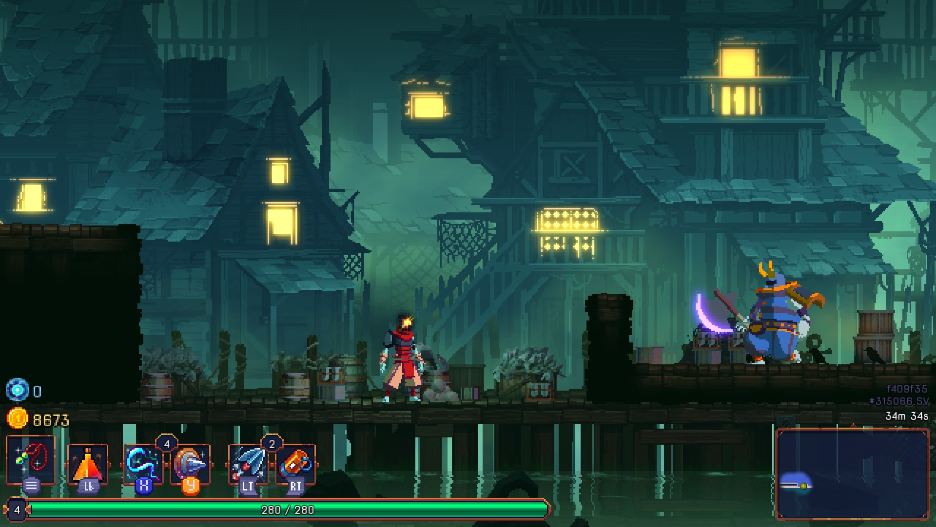 Και θα πολεμήσουμε, ξανά και ξανά, υπό ένα πλέγμα μηχανισμών τόσο καλοζυγισμένων που καταφέρνουν να διατηρούν την εμπειρία του Dead Cells φρέσκια και γοητευτική, όσες ώρες και να έχεις αφιερώσει για να τους αφομοιώσεις. Σε αυτό βοηθάνε δύο, κυρίως, παράμετροι. Από τη μία το βάθος ενός συστήματος μάχης που βασίζεται στην γνωστή αμυντικογενή λογική των παιχνιδιών της From με τις μανούβρες αποφυγής σε πρωταρχικό ρόλο και την ασπίδα να λειτουργεί ως κυματοθραύστης στις αλλεπάλληλες επιθέσεις των αντιπάλων, ενώ η μπάρα αντοχής ανηλεώς μας απαγορεύει να σπαμάρουμε τις δύο επιλογές απερίσκεπτα. Από την άλλη έχουμε τα διαφορετικά loadouts, τον εξοπλισμό δηλαδή που προκύπτει σε κάθε προσπάθεια μας και ο οποίος μπορεί να αλλάξει ριζικά το στυλ παιχνιδιού μας: το Electric Whip, για παράδειγμα, εντοπίζει και χτυπάει τους εχθρούς από απόσταση, ενώ τα (αγαπημένα μου) twin daggers ευνοούν ριψοκίνδυνες, σώμα με σώμα μονομαχίες αφού εξασφαλίζουν critical hit ανά τρεις συνεχόμενες επιθέσεις. Η ταχύτητα και η βιαιότητα των μαχών ήταν που μου έφεραν στο νου το Bloodborne περισσότερο κι απ'το Dark Souls καθώς ήταν η βασική διαφορά μεταξύ των δύο, κατά τ'άλλα συγγενών, τίτλων.